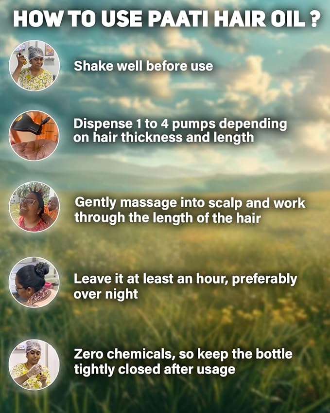 Our paati hair oil made with love and care by our 80+yrs old paati. Free from chemicals. So babies to elders all genders can use regularly, No special care needed. Promotes hair growth, Improves hair softness, Prevents split ends, Slows down greying of hair, Eliminates dandruff, Strengthen hair roots. Ingredients: Coconut Oil, Curry Leaves, Fenugreek Seeds, Amla, Hibiscus, Henna Leaves. ISO & GMP certified and Approved by FDA.